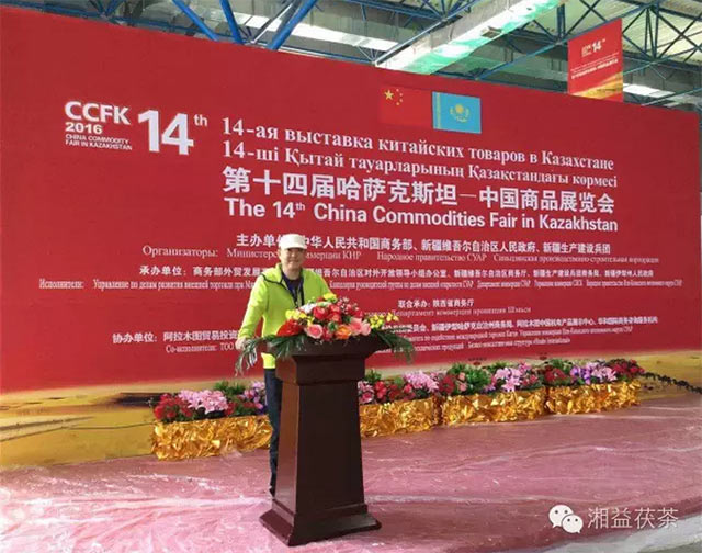 第十四屆哈薩克斯坦——中國商品展覽會于2016年5月20日在哈薩克斯坦阿拉木圖市隆重開幕。為積極落實中央關于加快推進絲綢之路經濟帶建設,加大企業(yè)開拓中亞新興茶葉市場,提升湘益茯茶在中亞各國的品牌優(yōu)勢,新疆新益茶業(yè)有限責任公司做為兵團代表之一向國外客商及消費者展示了湘益牌系列茯磚茶產品并受到一致好評。