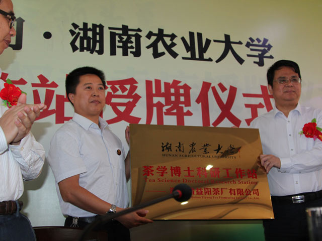 2015年10月22日,湖南農(nóng)業(yè)大學(xué)茶學(xué)博士科研工作站授牌儀式在湖南省益陽茶廠有限公司隆重舉行。